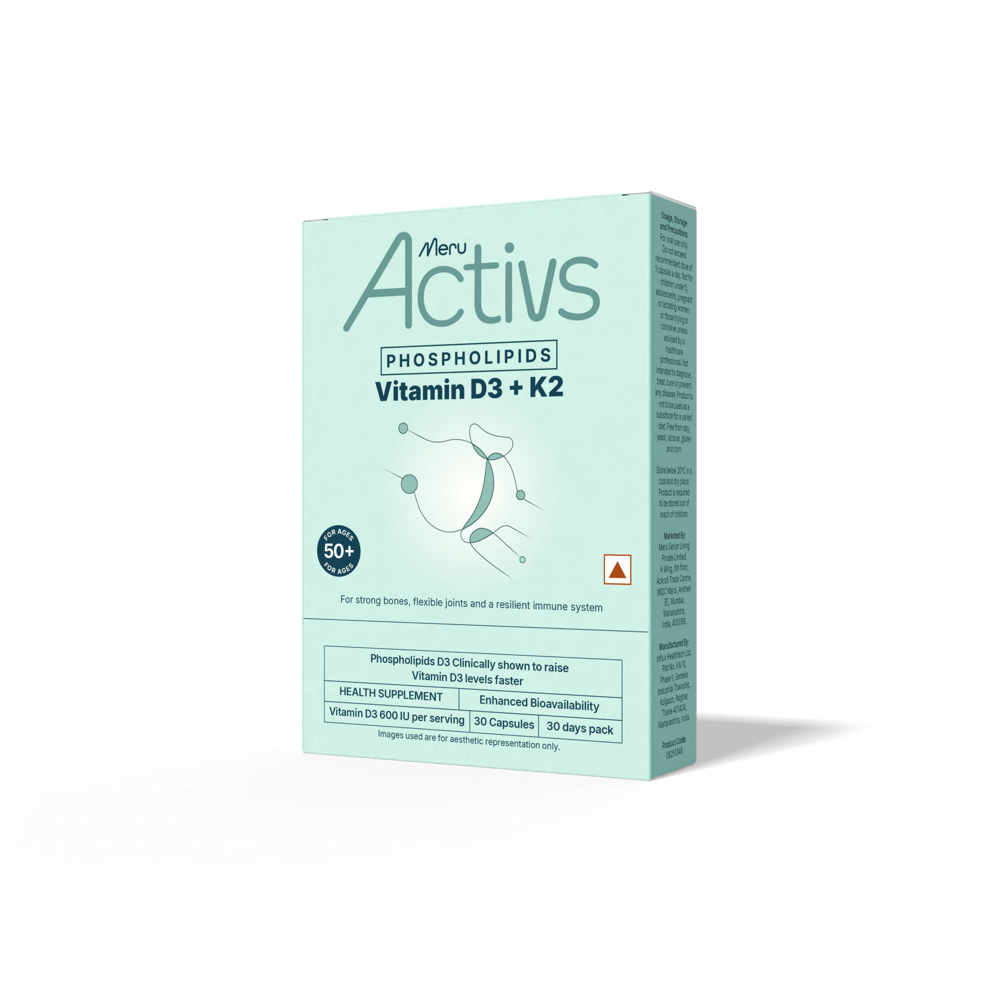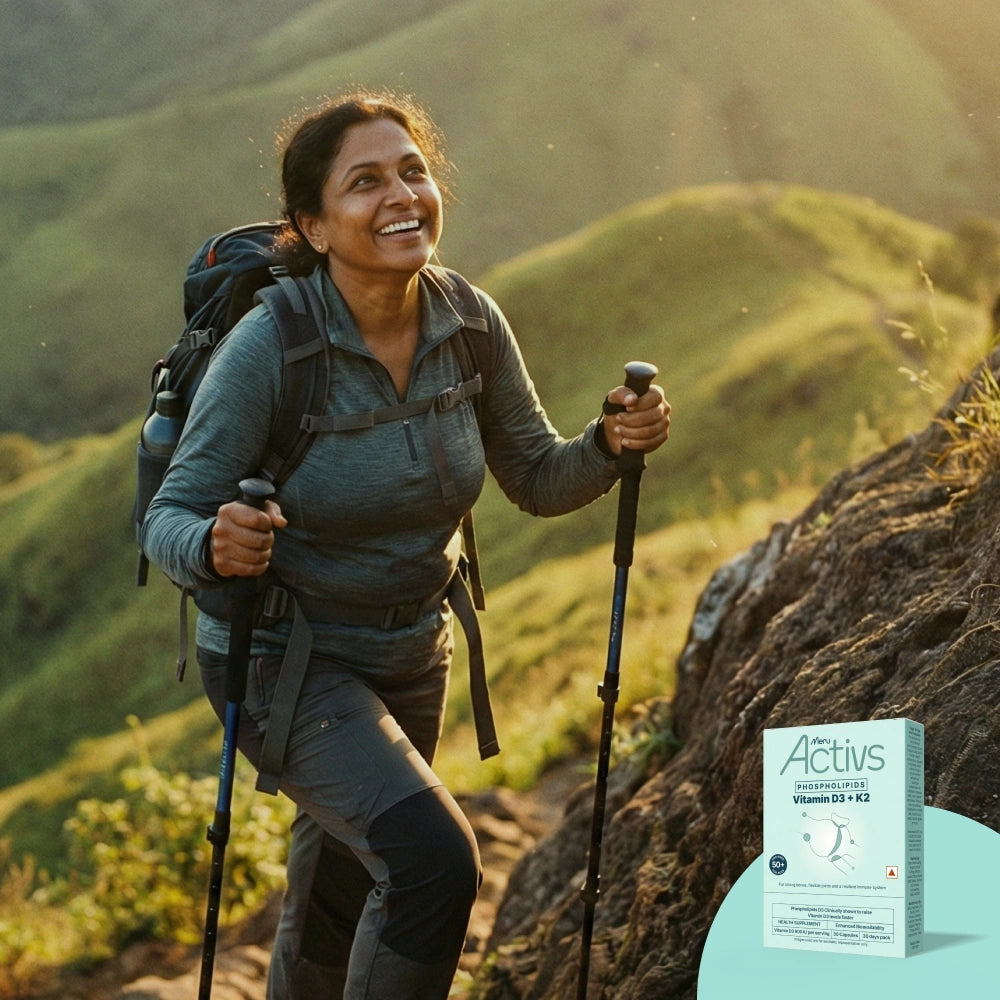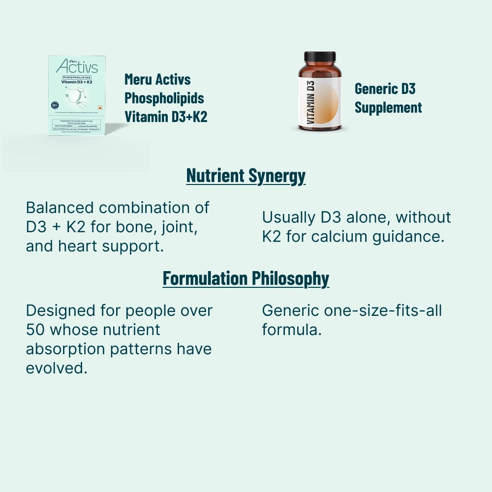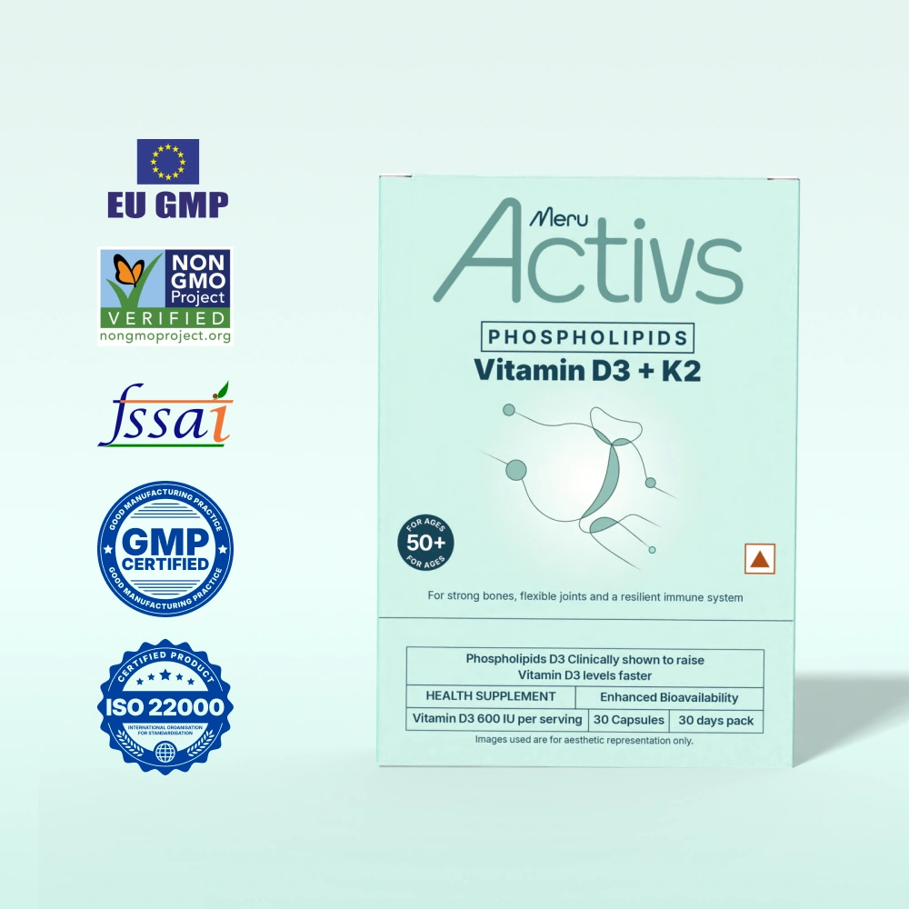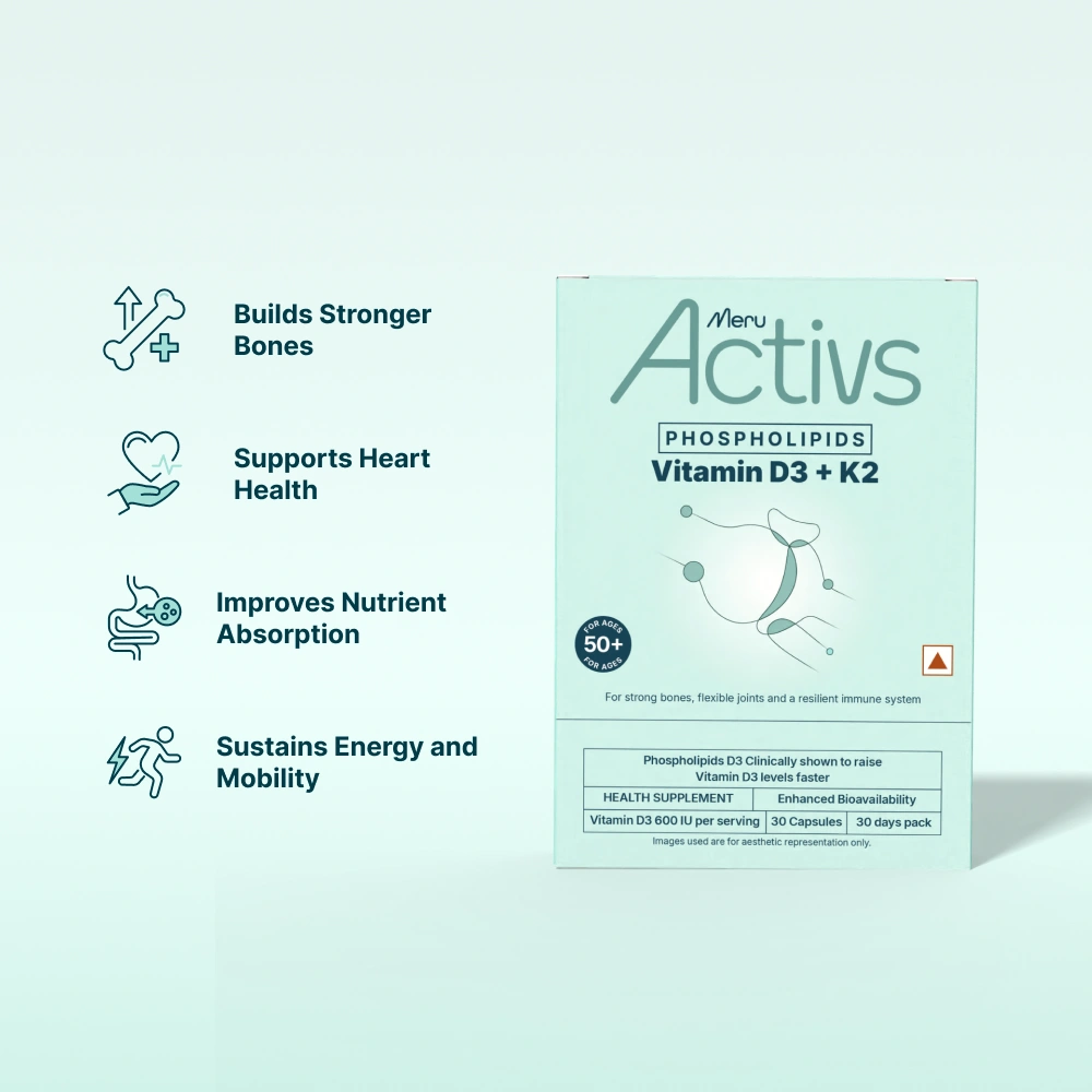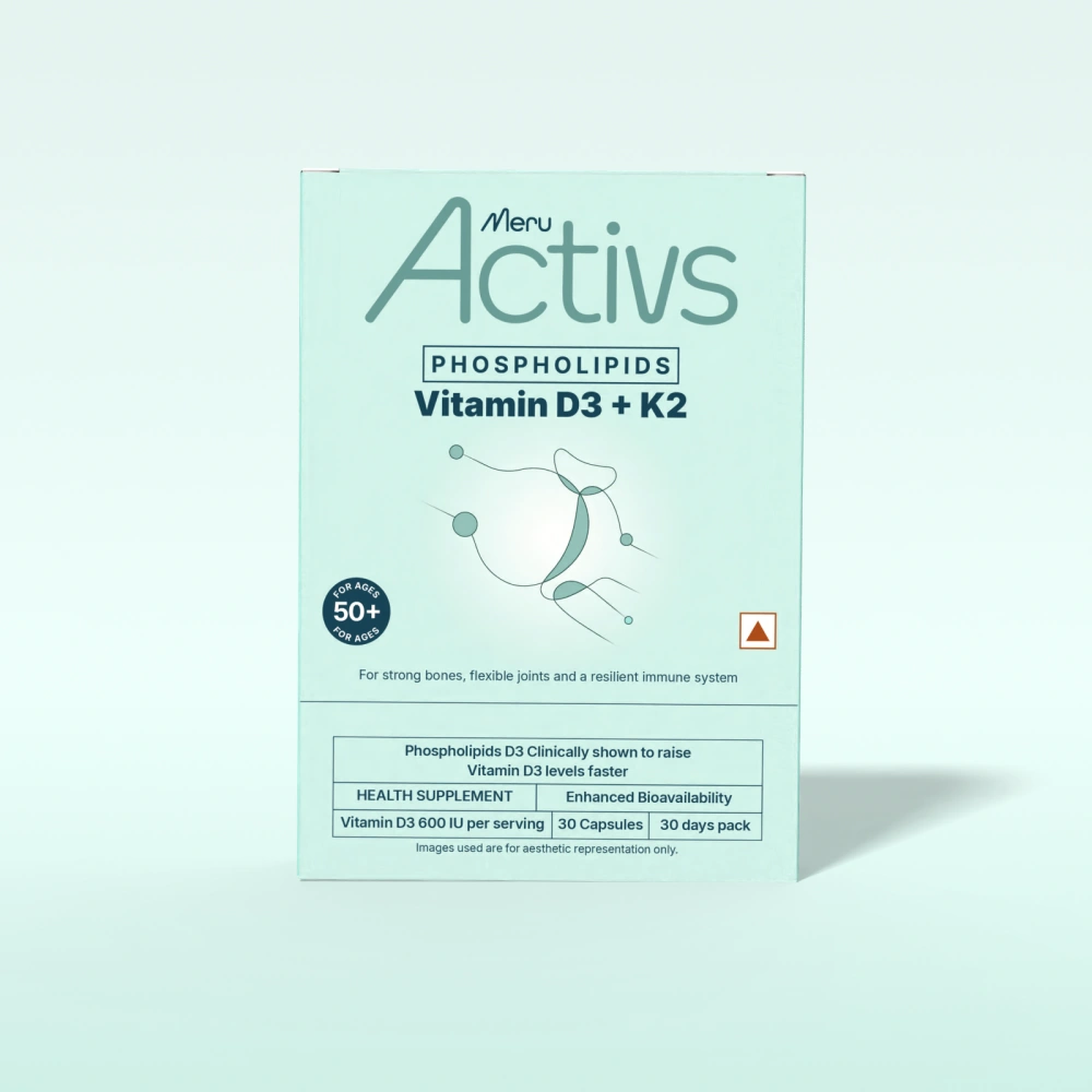 Meru Activs™ D3 + K2 combines two essential nutrients that work in synergy to support bone density, heart flexibility, and overall vitality.